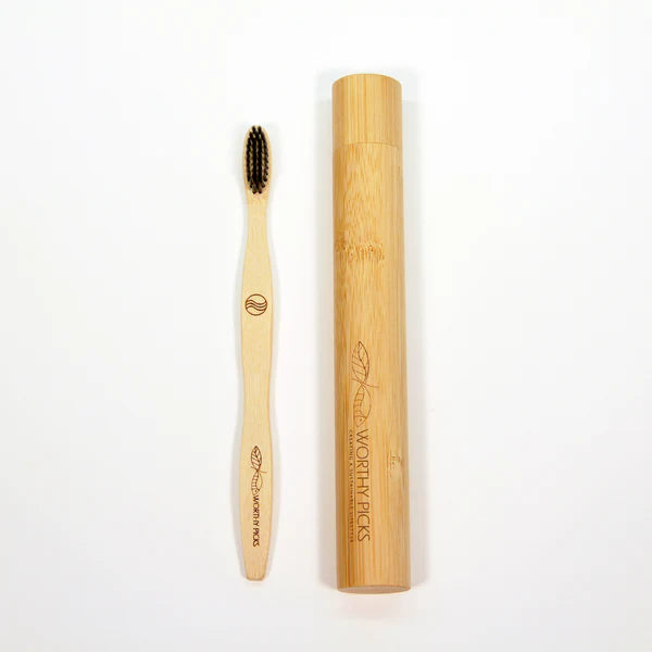 Worthy Picks bamboo toothbrush travel case is made from natural polished bamboo! This bamboo travel case is so beautiful and super light weight! Perfect to pack your bamboo toothbrush and eliminate more plastic from your life.